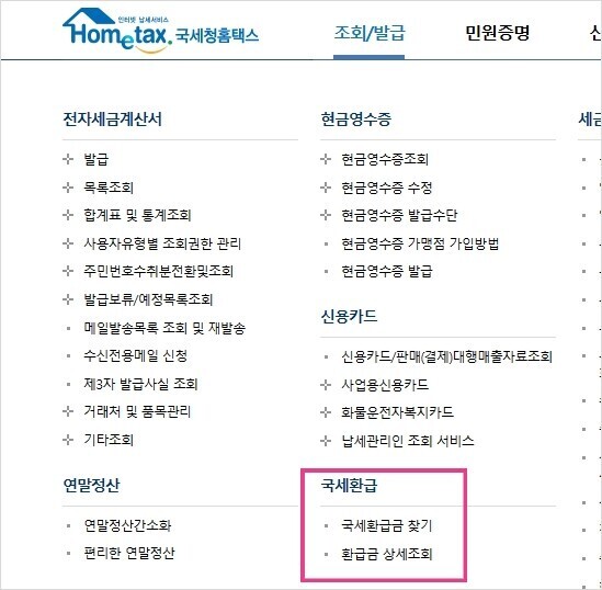 홈택스 > 로그인 > 상단 '조회/발급' > 국세환급 > 국세환급금 찾기 및 환급금 상세 조회